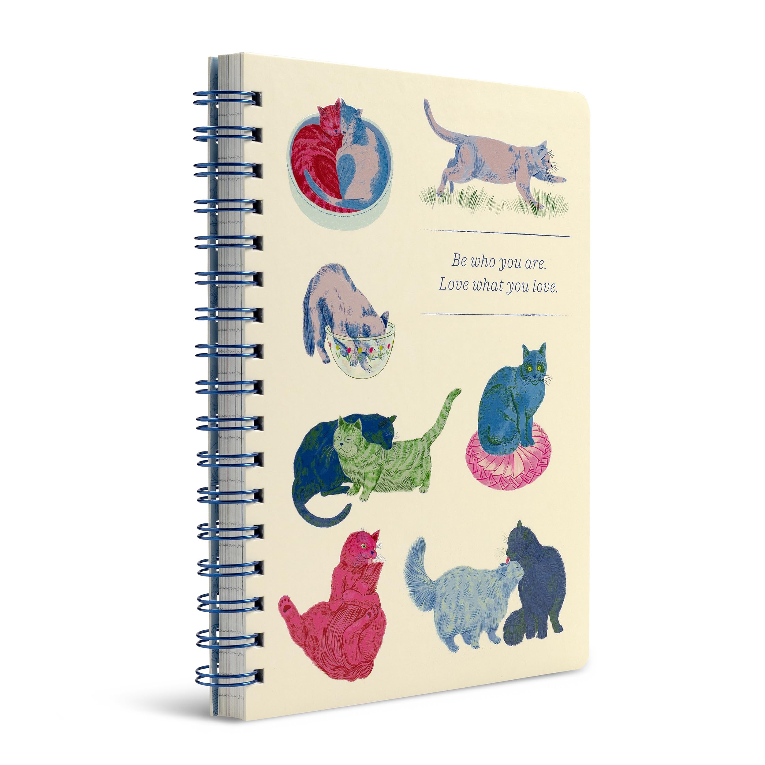 - INSPIRING COVER: This spiral journal features adorable cat-themed artwork and a foil-stamped statement that reads, “Be Who You Are. Love What You Love.”